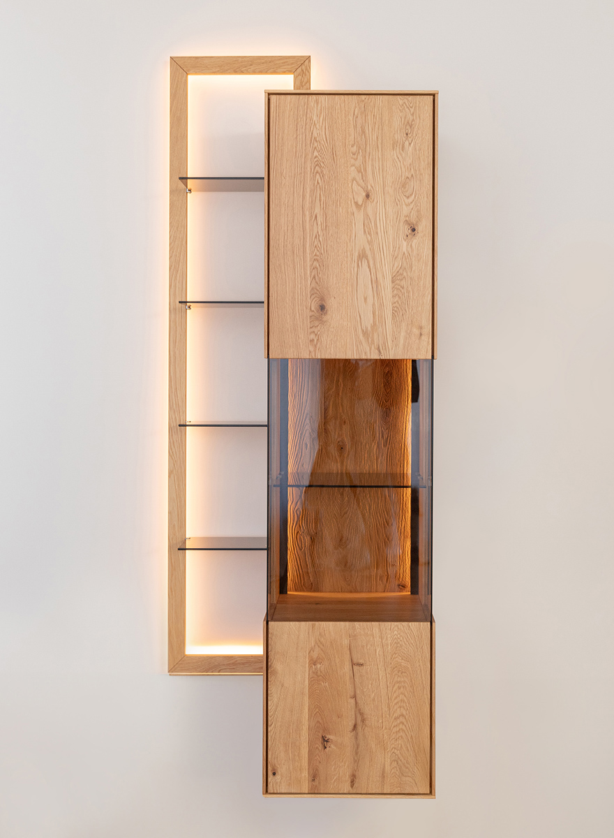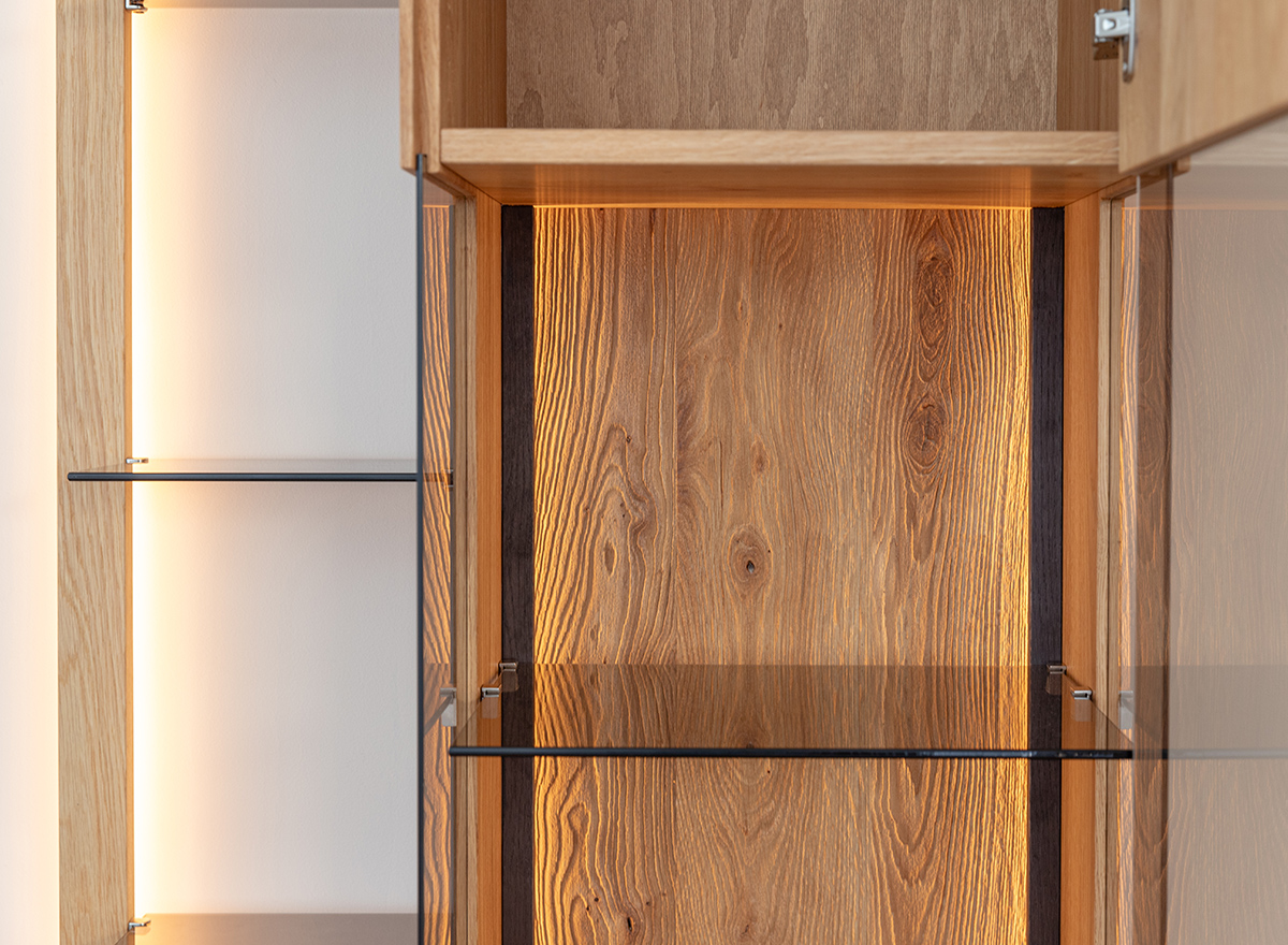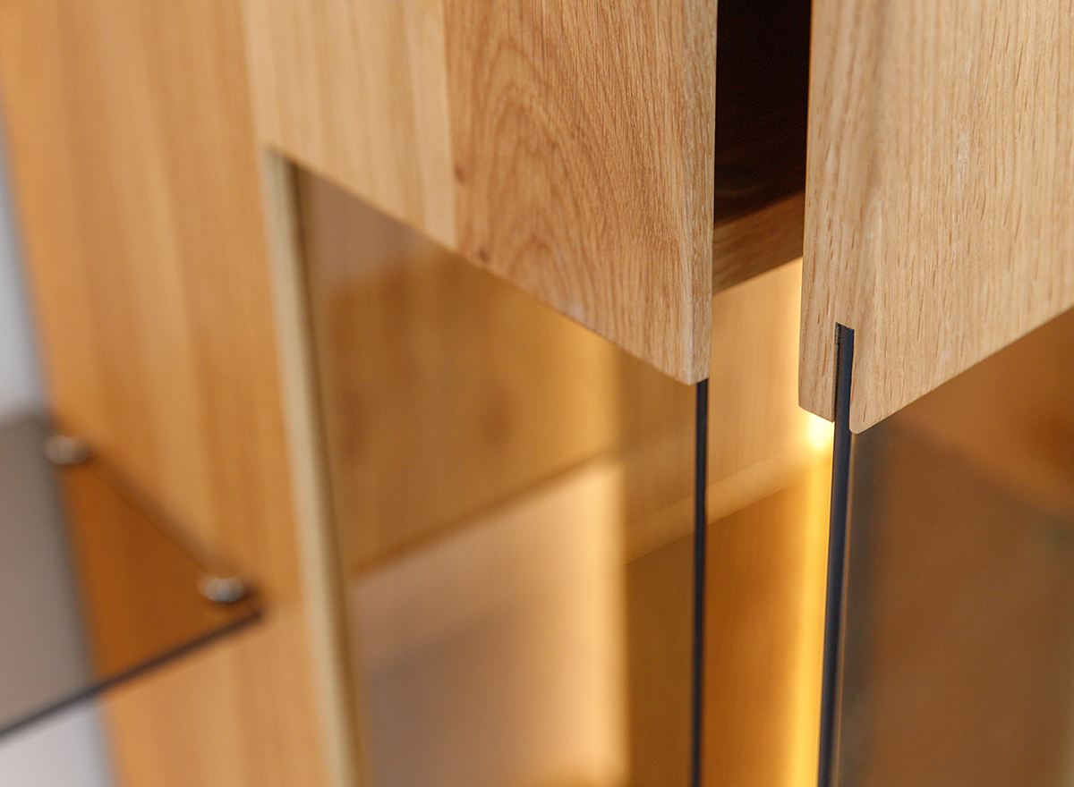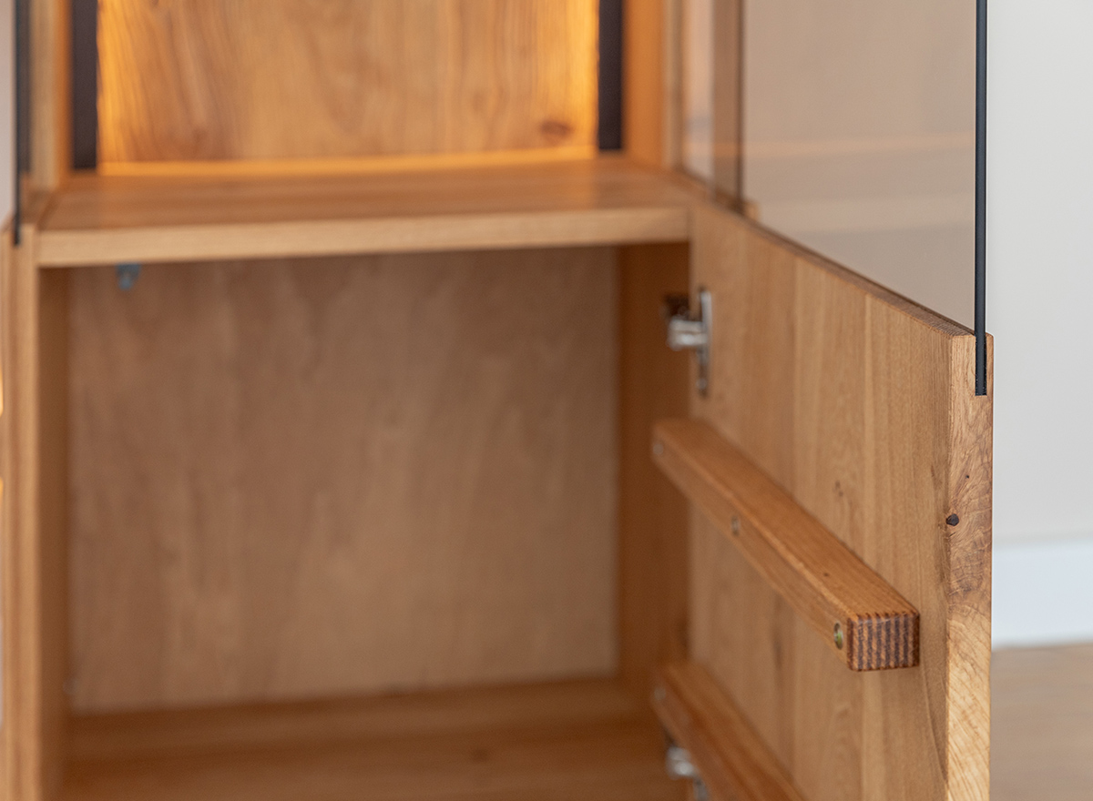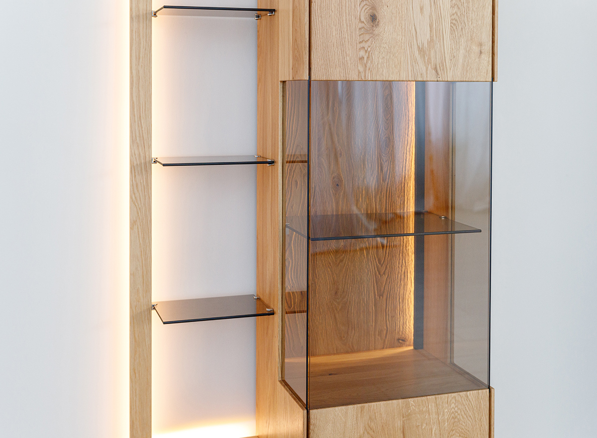 Schutz. Vollfronten aus Massiveiche, getönte Scheiben und leichte Glasböden sind charakteristische Merkmale