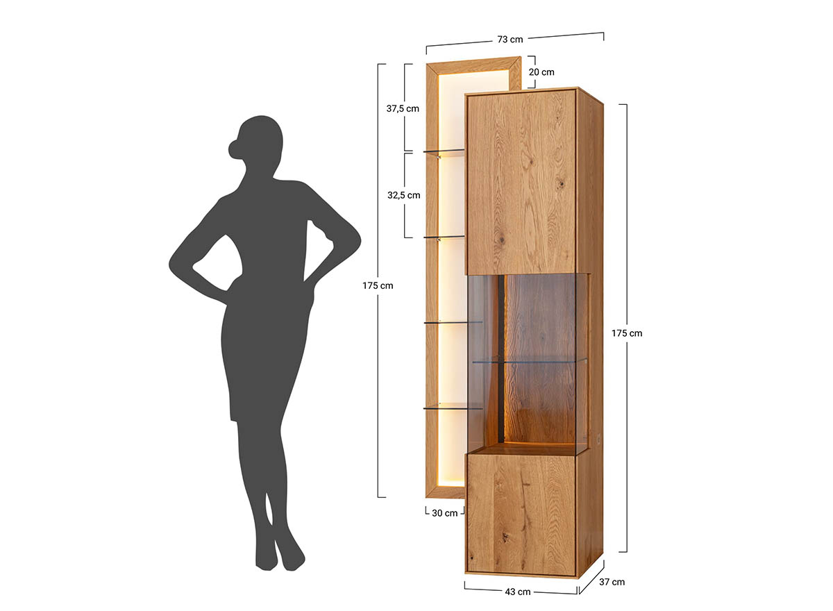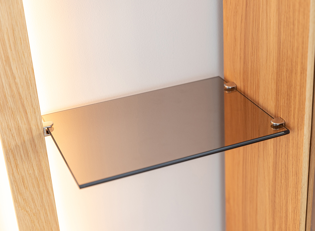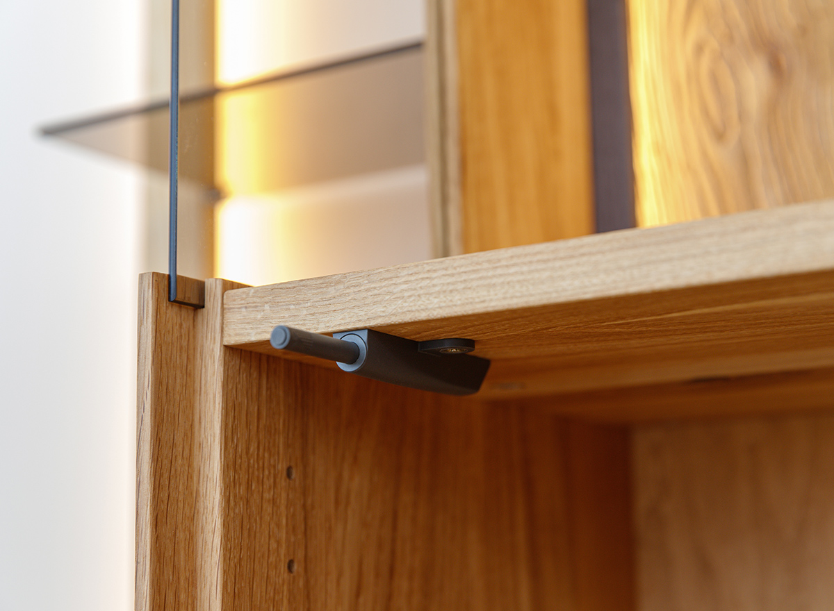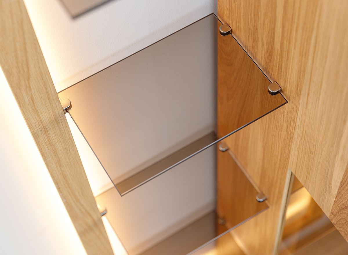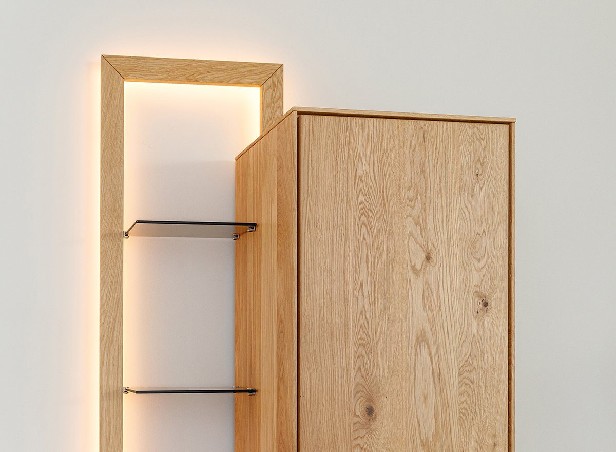 Schutz. Vollfronten aus Massiveiche, getönte Scheiben und leichte Glasböden sind charakteristische Merkmale