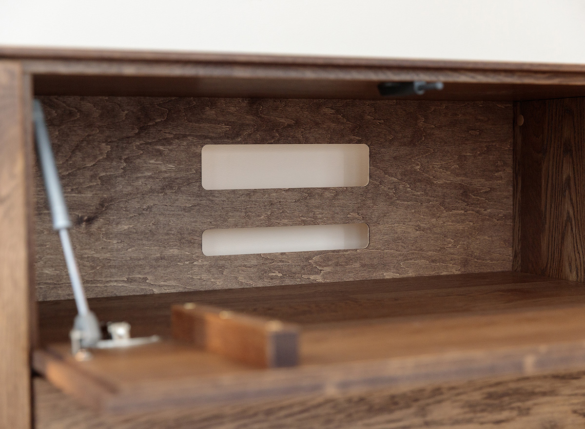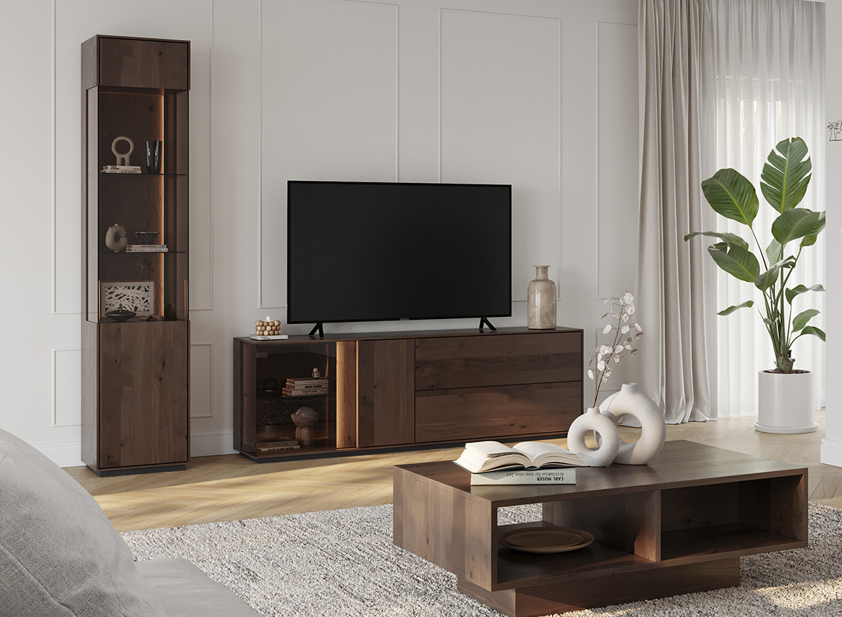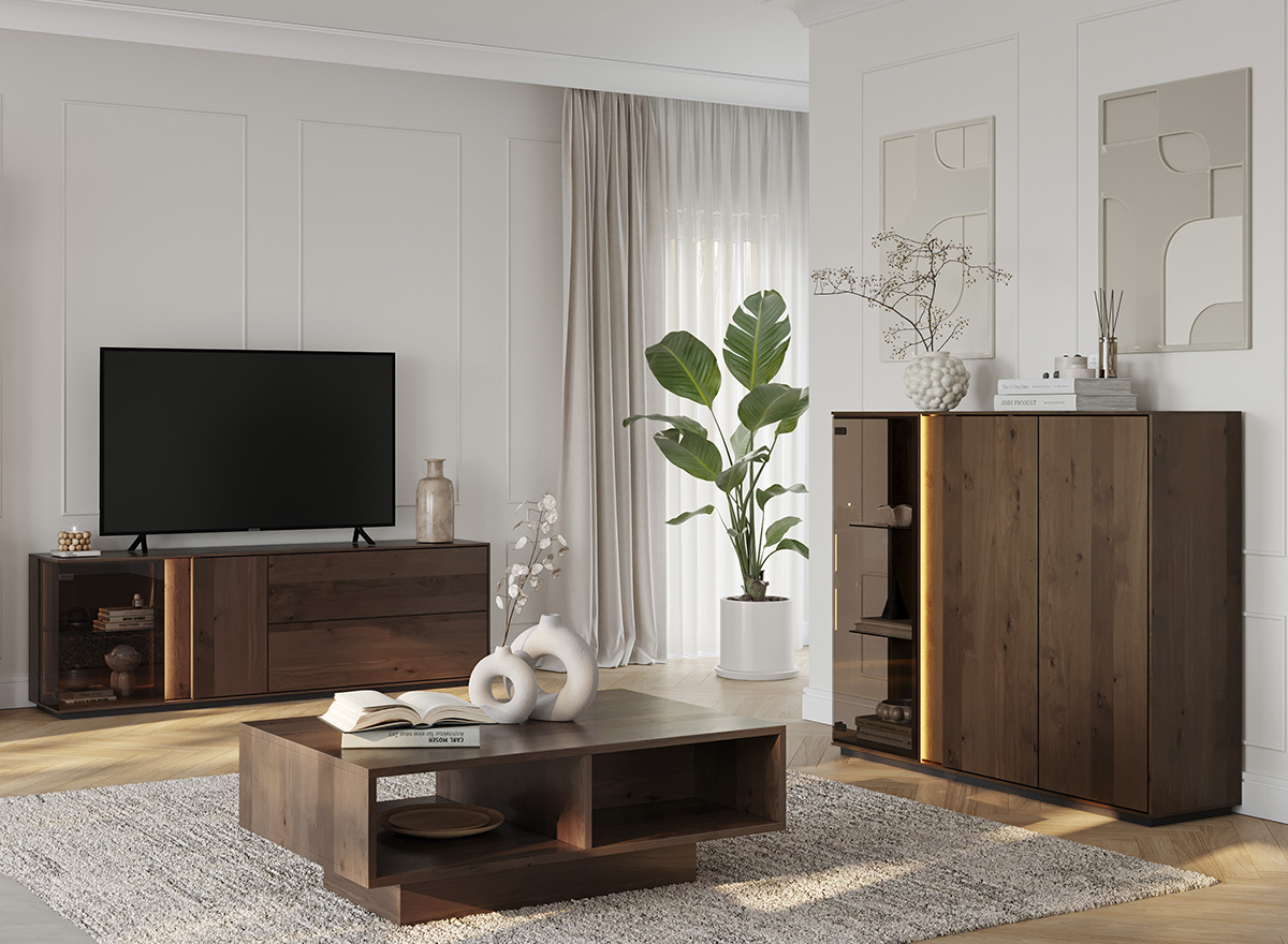 ichliche Haltbarkeit mit der natürlichen Schönheit von Edelholz. Der tiefe Tabak-Ton harmoniert wunderbar mit der einzigartigen Maserung und dem Astmuster und schafft eine gemütliche Atmosphäre. So zeigen die Möbel