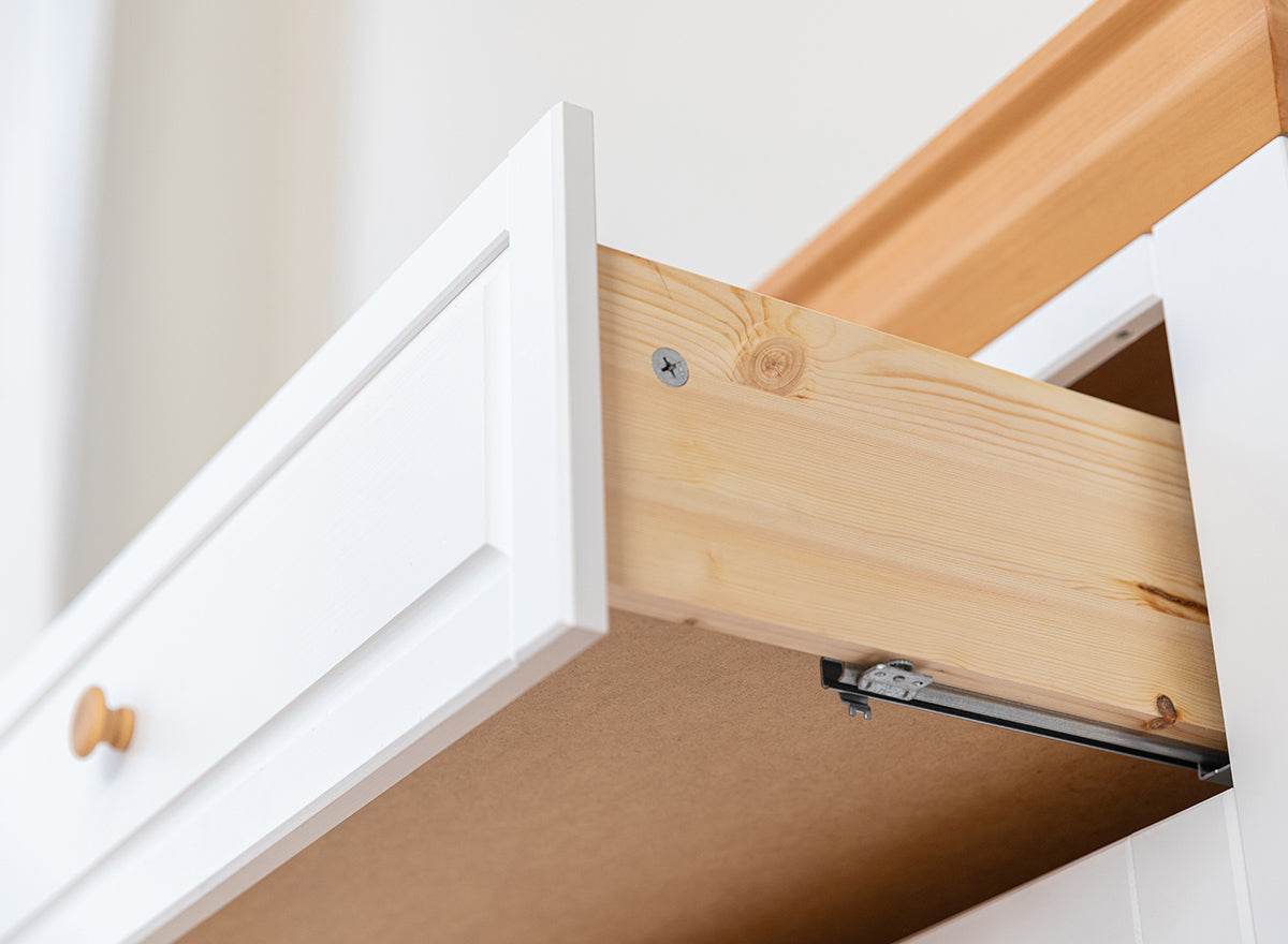 Korpusse sind mit Wasserlack und die Platten und Abdeckungen mit Beize geschützt. Die Schubladen mit geräuschlosem Einzug