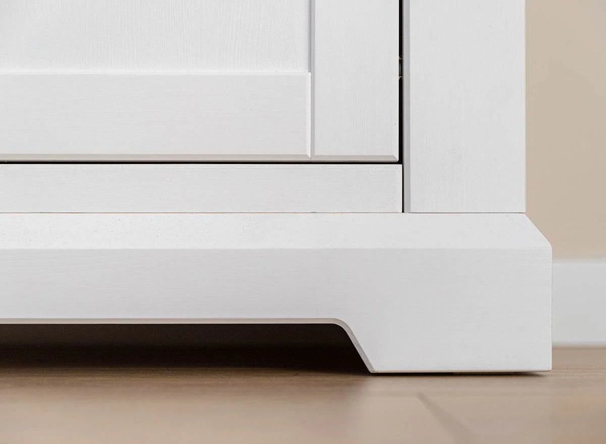 durch dekorative Fräsungen und Sprossen betont. Der gefräste Sockel bildet ein stilvolles Duett mit den Rahmen der Fronten. Die