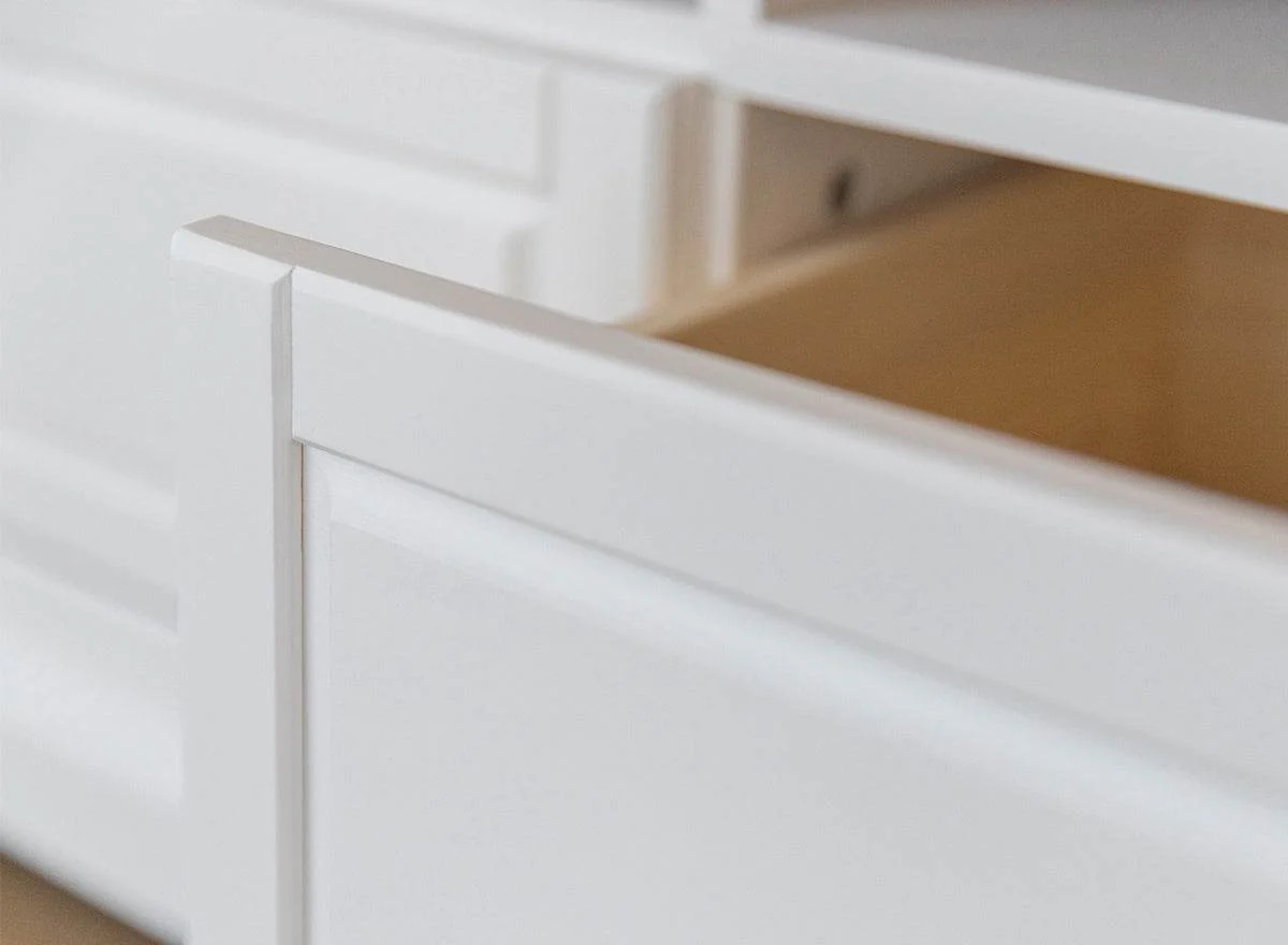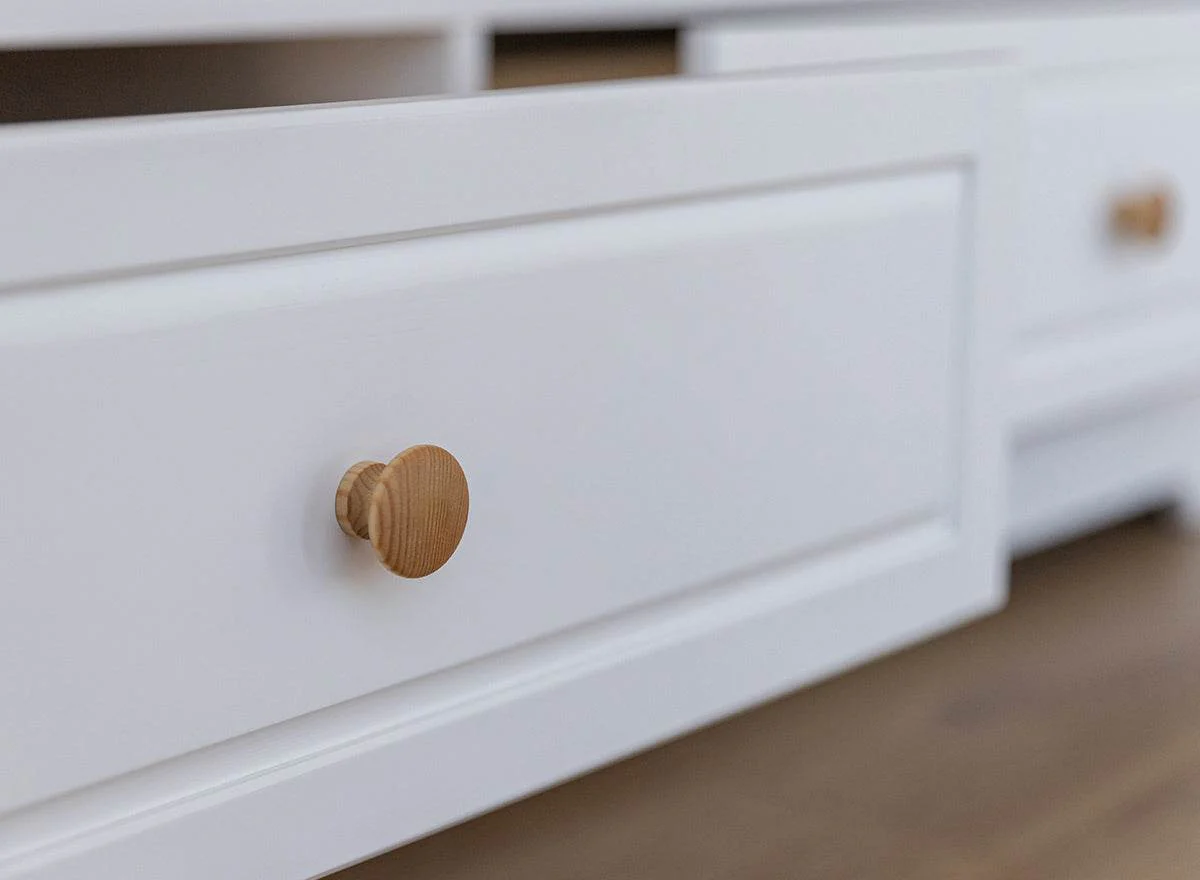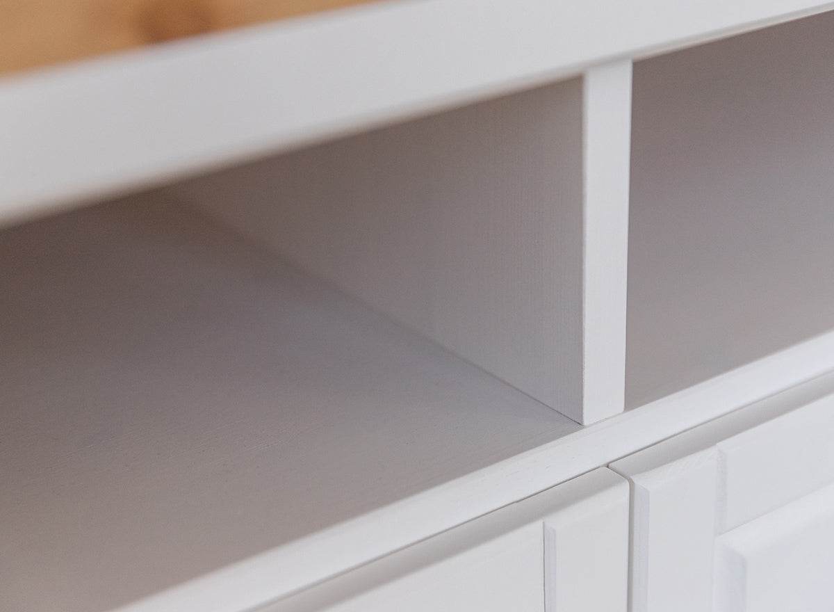 Korpusse sind mit Wasserlack und die Platten und Abdeckungen mit Beize geschützt. Die Schubladen mit geräuschlosem Einzug